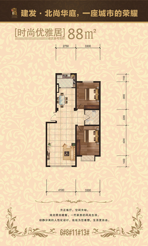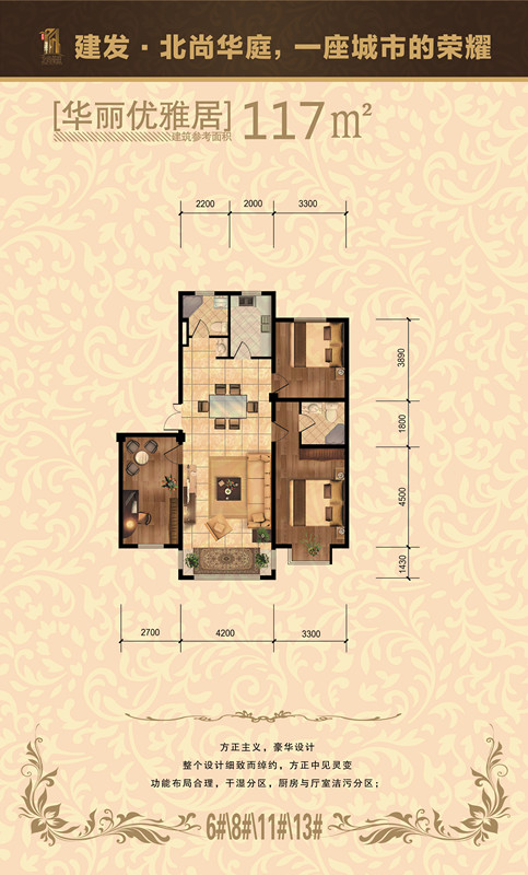 建发•北尚华庭是建发集团30余年地产开发建设之大成,在辽阳市城北核心区域倾情打造的特色高端宜居项目。旨在以优质的建筑工程为依托,以完善的物业管服为保障,倾情打造一个超越客户期待的高品质现代都市生活圈。该项目以情景洋房为主打,在本埠首推下沉式庭院设计理念,时尚悦目的建筑立面和空间格局,加之环周配以高层、小高层丰富产品线,人车分流,会所、商业区、园林式庭院天然围合,定会给久居古城传统风格住宅的置业者以惊喜。